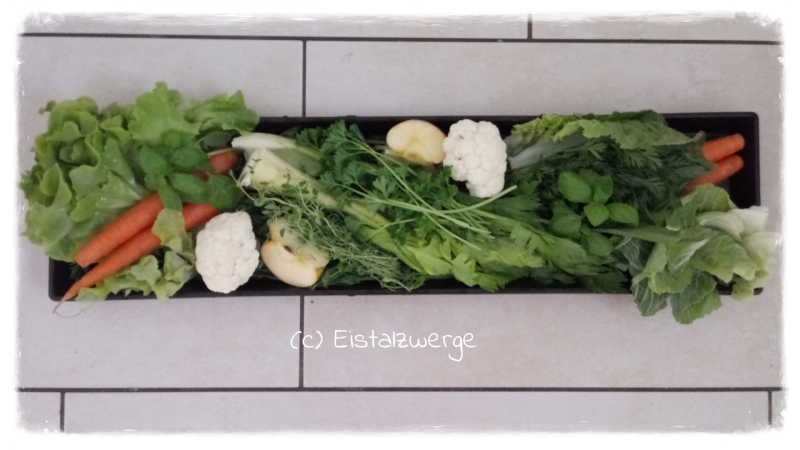 Abends gibt es verschiedene Sorten Strukturmüsli von Grünhopper, eine kleine Menge Kräuterpellets von Bunny und Pfälzer Bricks. Das Futter von Grünhopper ist sehr vielfältig und grob strukturiert, so dass es an die jeweilige Lebensphase des Kaninchens angepasst werden kann und für den notwendigen Zahnabrieb sorgt. Die Pellets von Bunny, vom Hersteller TriMellos genannt, enthalten eine hohe Artenvielfalt an Wiesenkräutern und eine an Kaninchen angepasste Menge zusätzlicher Vitamine und Mineralstoffe. Da weder getrocknete Kräuter noch Supermarktgemüse die erforderliche Menge enthalten, halte ich diese „Vitamintablette“ für unerlässlich. Die Pfälzer Bricks der Firma Schroers bestehen aus dem Pfälzer Müsli, einem hohen Anteil an Kräutern und ebenfalls zugesetzten Vitaminen, Mineralstoffen und Spurenelementen.
