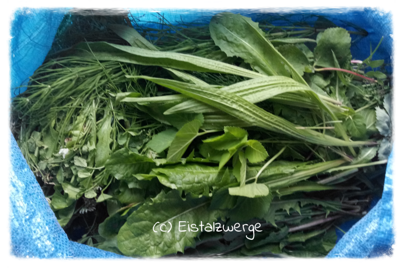 Im Frühjahr wird die Menge an Strukturmüsli allmählich reduziert und die Kaninchen an frische Wiesenkräuter gewöhnt. Bis zum Herbst stehen dann Spitzwegerich, Scharfgarbe, Labkraut, Luzerne, Rotklee, Weißklee, Löwenzahn, Breitwegerich, Fünffingerkraut, Ackerschachtelhalm, Beifuß, Vogelmiere, Giersch, etc. täglich zur Verfügung, ebenso frische Zweige von Haselnuss, Apfelbaum, Buche, Weide etc. Einen kleinen Teil davon bauen wir auch selbst im Garten an.