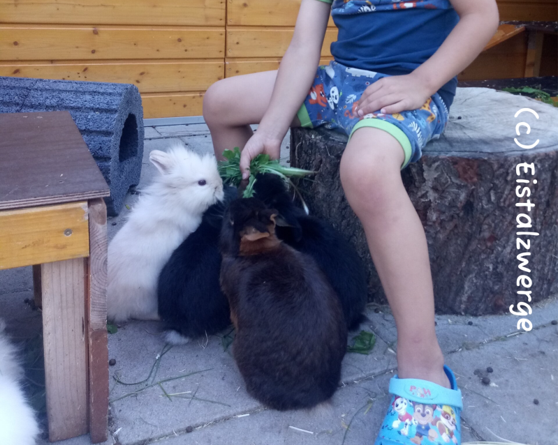 Alle unsere Kaninchen fressen gerne aus der Hand und kommen sofort angehoppelt, sobald man sich ihnen nähert.